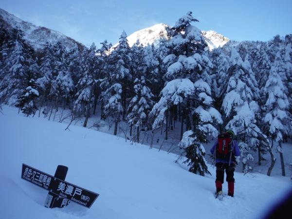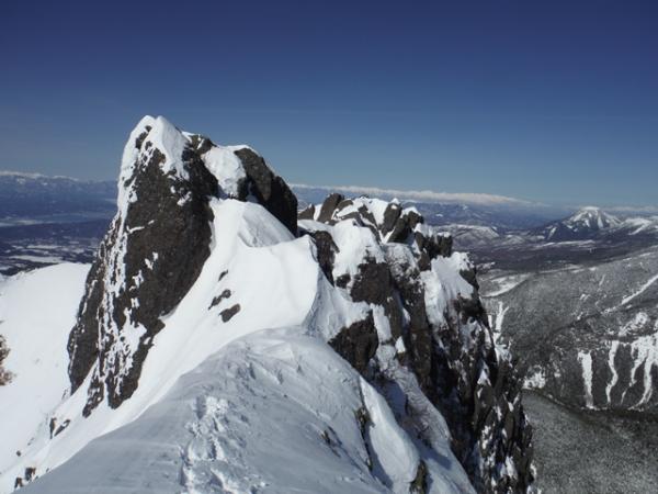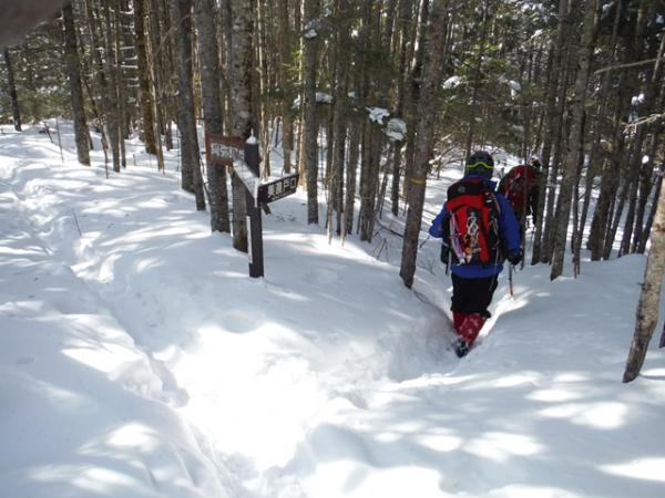 御小屋尾根:摩利支天付近滑落に注意。分岐までほとんど膝から股のラッセル。トレースがはっきりないとこの時期はシンドイ。
