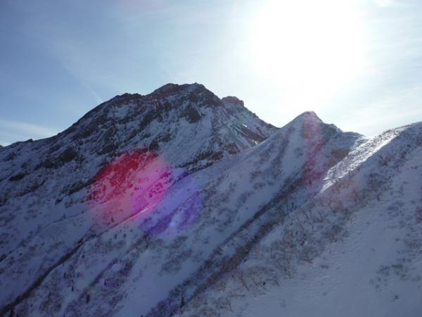 行者小屋からジャンクションピークに繋がる尾根に経験者もっさんの案内で取り付き登るのだがトレースは雪で埋もれて膝くらいの深さをモフモフしながら登ることに。1時間半くらいかけて 太陽の温もりを感じながら草つきの急登に到着。傾斜はそこそこあり所々固い場所もあったりしますが手足の置き場は豊富でした。が足を滑らすともちろん滑落。気は抜けません!