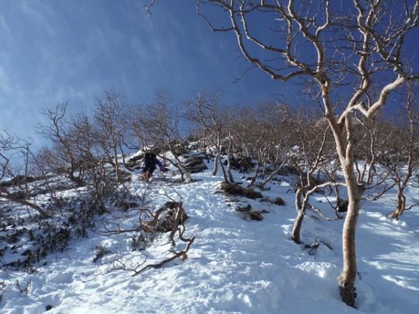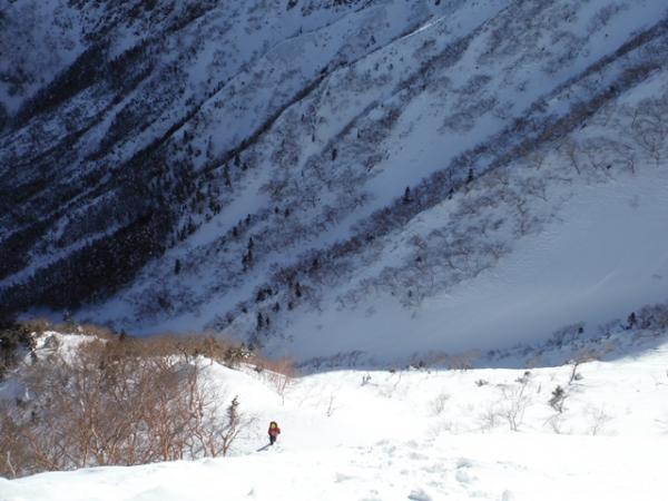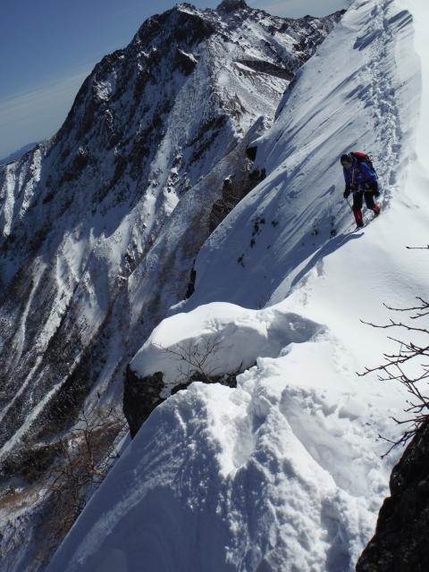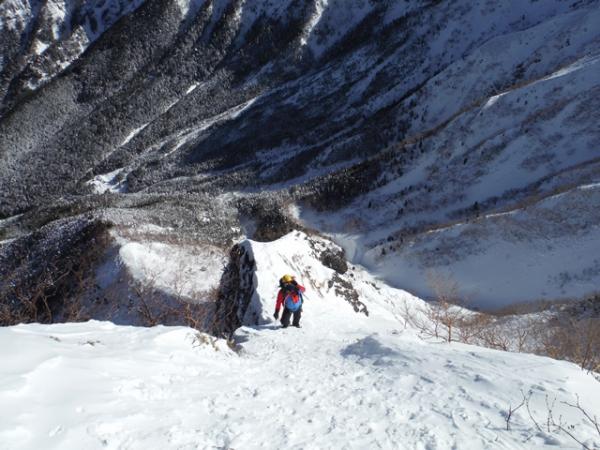 下山は御小屋尾根を使うことに。摩利支天付近は痩せて緊張感を感じ、急登部を降ると股から膝のラッセルが延々と下部まで続きました。正直、北稜よりも疲れました( ̄□||||!! 文三郎経由南沢のがはるかに下山できたでしょーなー。失敗。