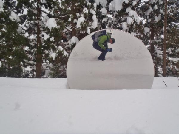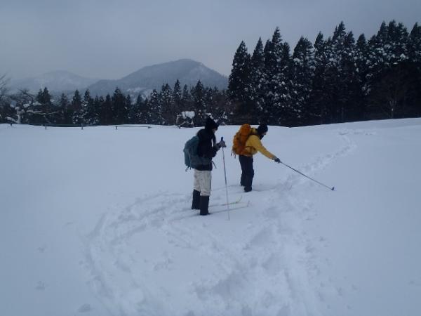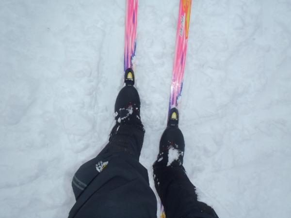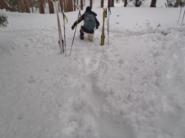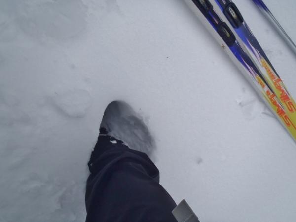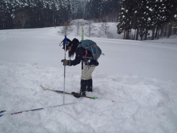 スノーシューやワカンと違って長さがあるので沈む量は比べ物になりません。