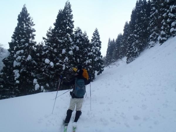 下りはスキーを滑らせるので楽チンと思いきや足を取られてよく転びます。