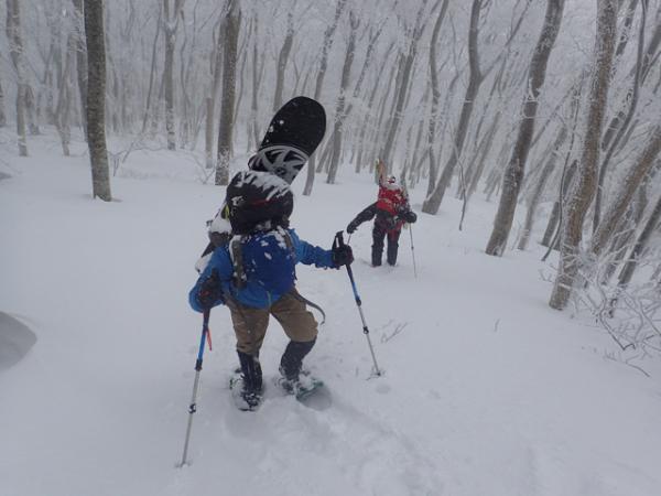 途中トレースが付いている所がありましたが、少し外すとスノーシューを履いていても膝上までいくくらい雪がフカフカでした。