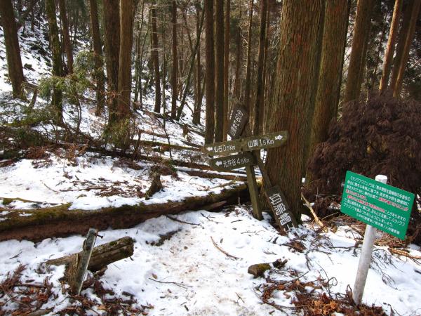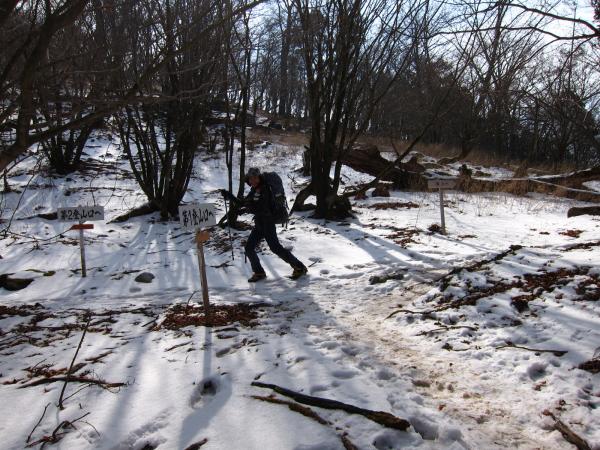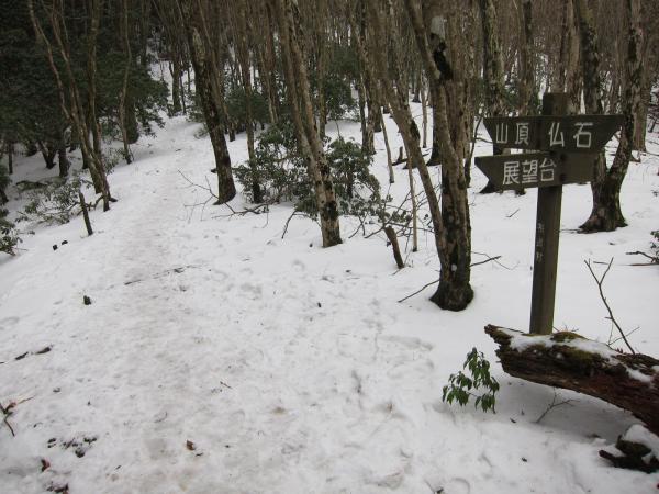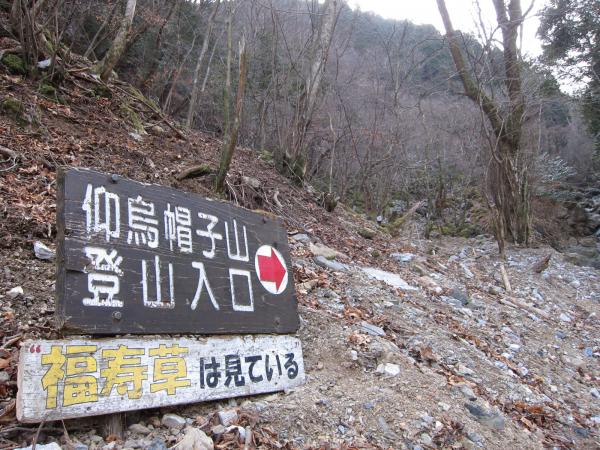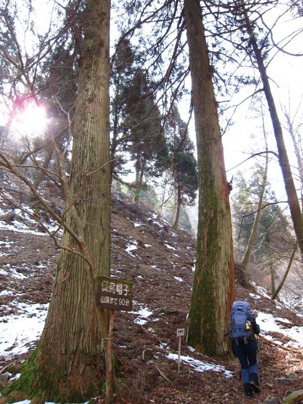 - 元井谷登山口→(50分)→夫婦杉→(30分)→仏石分岐→(10分)→仏石(福寿草群生地)→(60分)→仰烏帽子山[1302m]→(40分)→仏石分岐→(90分)→元井谷登山口