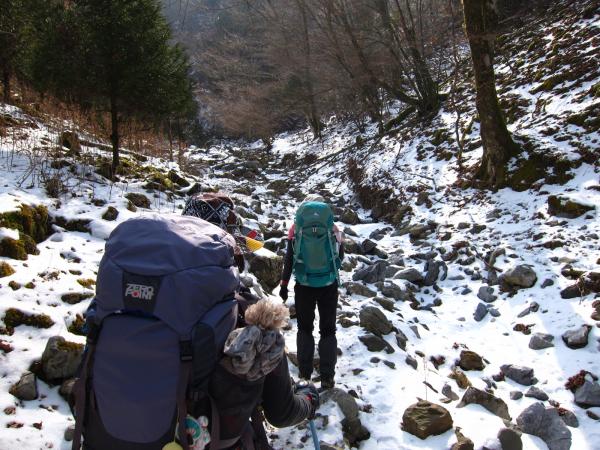 元井谷登山口からの登山道は、水害による倒木や岩がゴロゴロの枯れ谷の中を進みます。