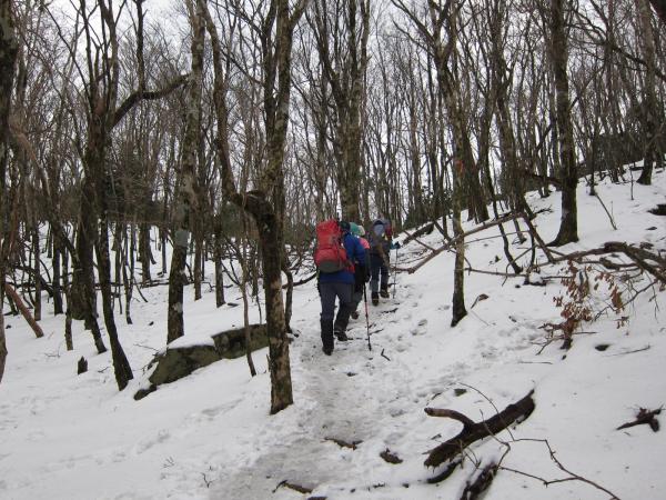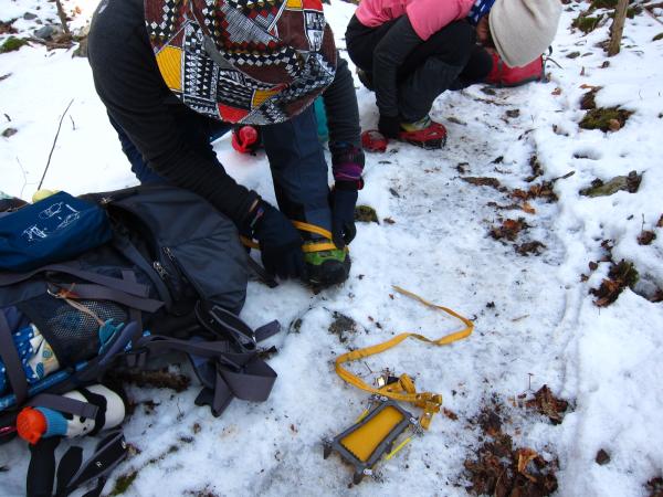 標高1,000m辺りから、凍結箇所が滑るため念のため軽アイゼンを装着。