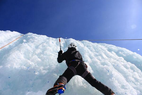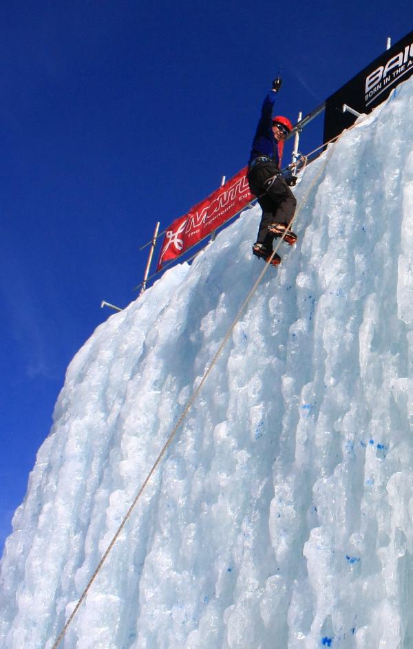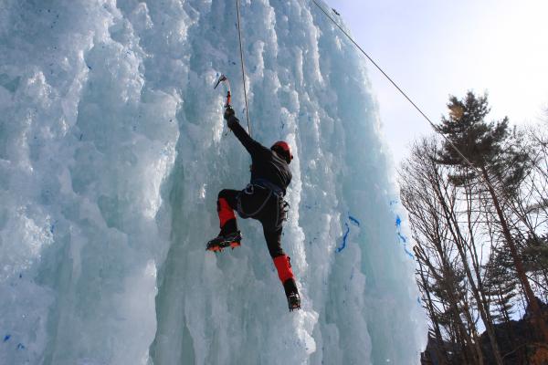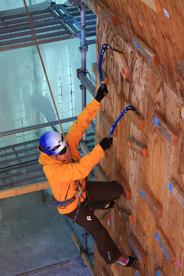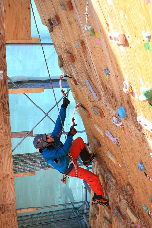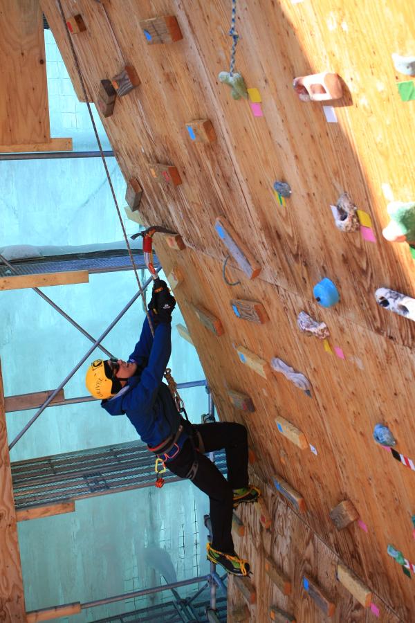 色々なアイスバイルとクランポンを使用し、アイスクライミングとはどういうものかと、ドライツーリングの体験をやりました。