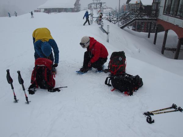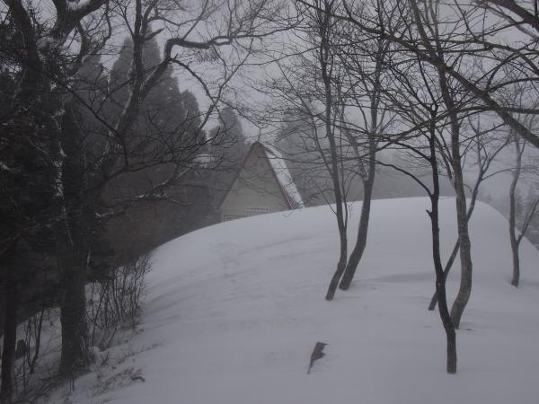 天候が悪いのはある程度覚悟で早朝出発。途中雨に降られながらも氷ノ山に向かうと、予想通りの雪模様。