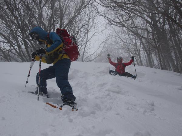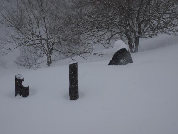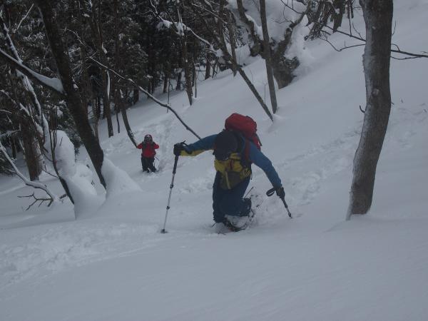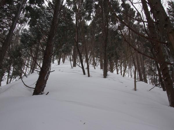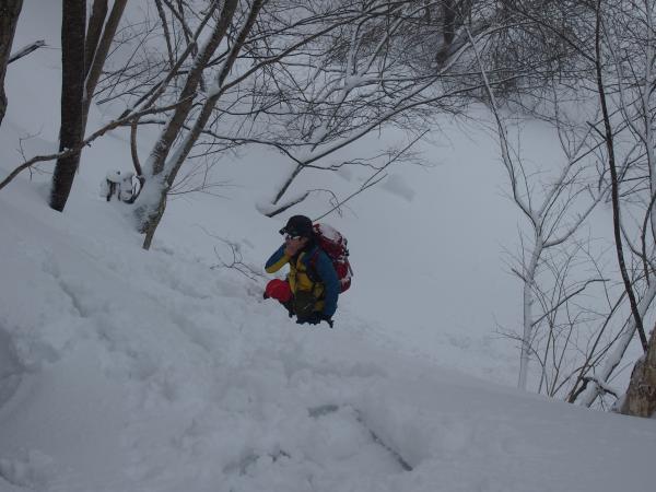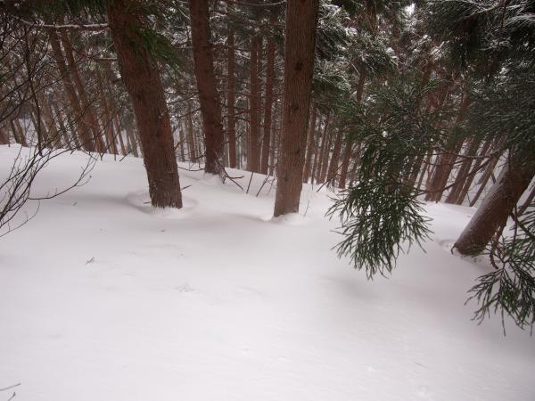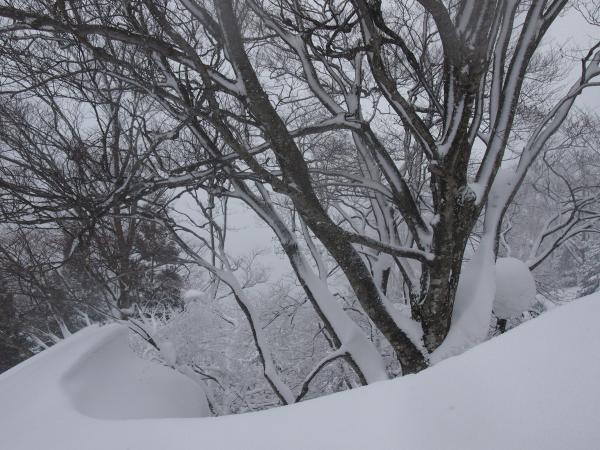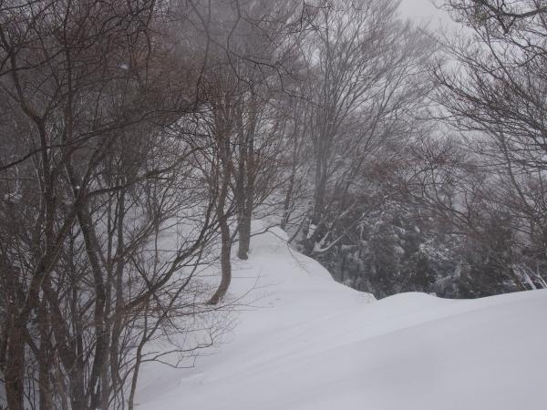 - 天候は冬型が徐々に強まっていく中、駐車場付近で徐々に雪模様に。ゲレンデ付近の林道は少し重かったですが新雪状態。東尾根に向かって標高が上がるにつれて風が強まり、尾根上は常時強風で、雪も混じって顔が痛いぐらい。上部の雪のコンディションは結構よく、最近の踏み跡も見られず気持ちの良い新雪。