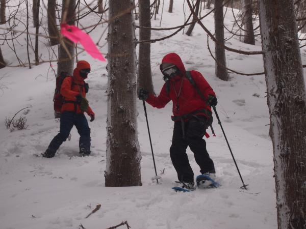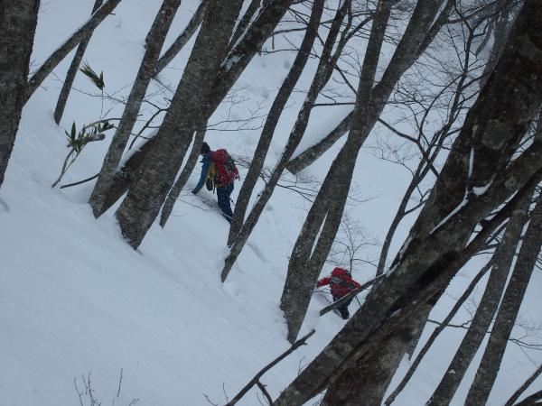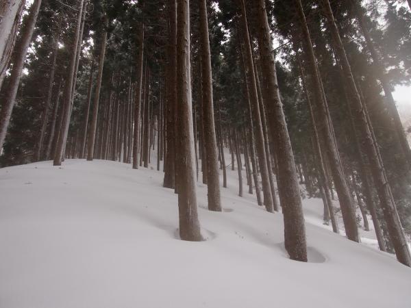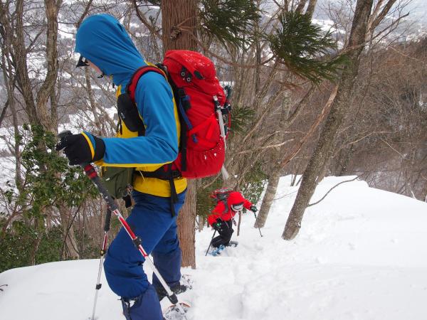登山口から尾根を目指しますが、途中から支尾根に入り尾根上に出るのに約2時間を費やしました。傾斜の急ないやらしい斜面のラッセルが連続しましたが、その分なかなか楽しく充実した雪山ハイクとなりました。メンバーの皆様、お疲れ様でした。