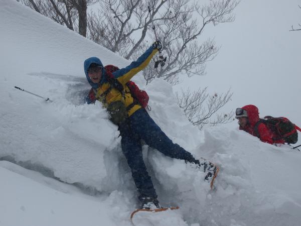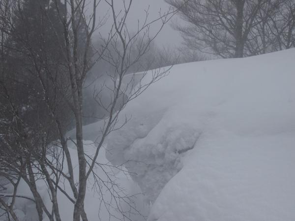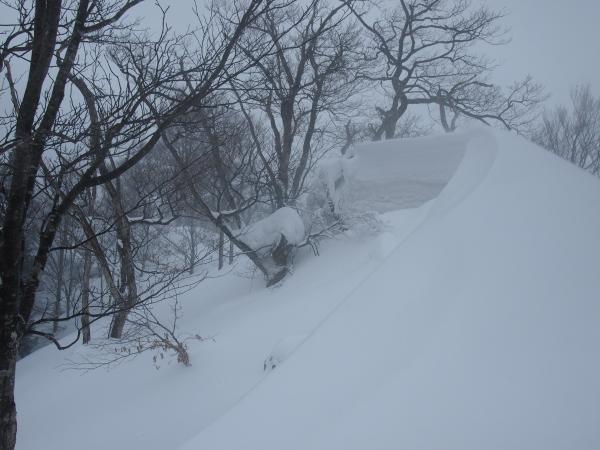 所々大きく雪庇が発達がみられ、風を受けるところはクラストしていました。