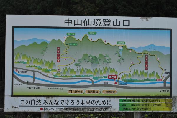 - 夷耶馬農村公園駐車場→(15分)→前田登山口→(65分)→無名橋→(15分)→高城→(20分)→隠洞→(15分)→中坊中登山口→(5分)→夷耶馬農村公園駐車場