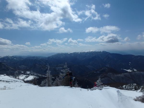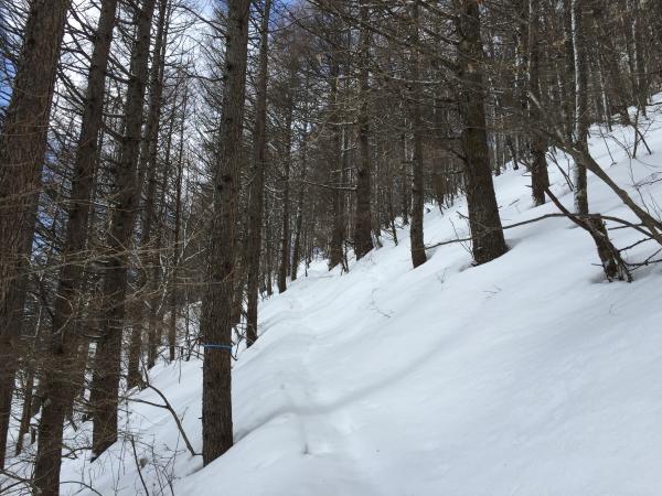 尾根に上がるまでは登山道もまだ歩きやすかったですが、尾根に出るとトレースは消え、