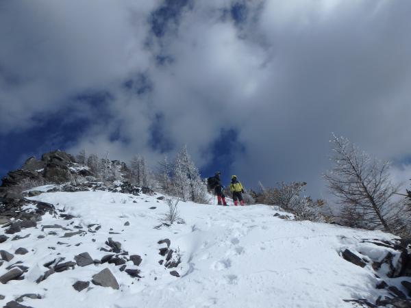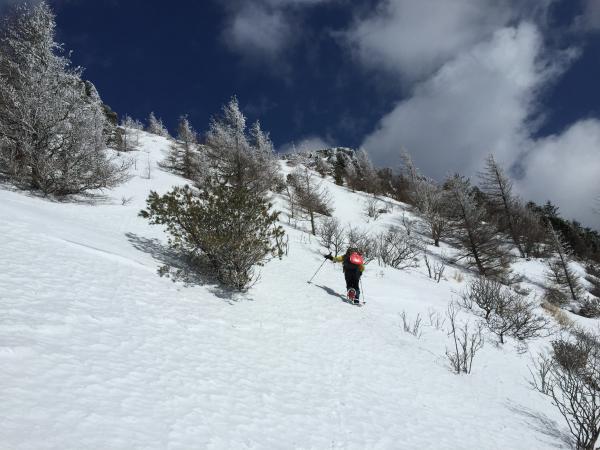 程良くしまった雪面をキックステップで登ります。ここはアイゼンもピッケル必要だなぁ。