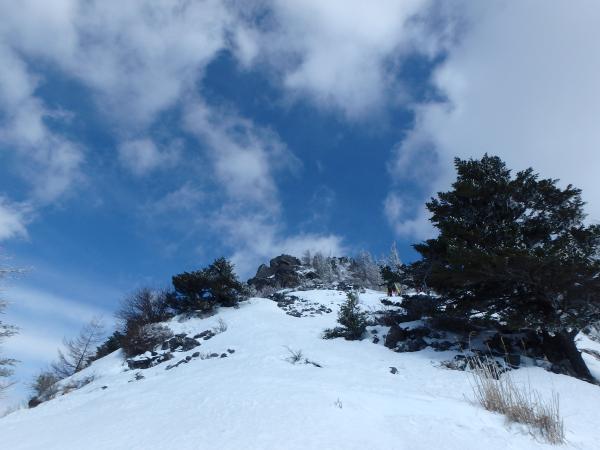 思ったより長い尾根。ようやく着いた山頂直下から見上げる王ヶ鼻。