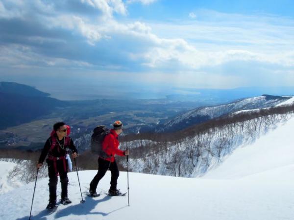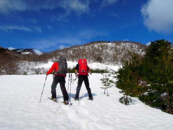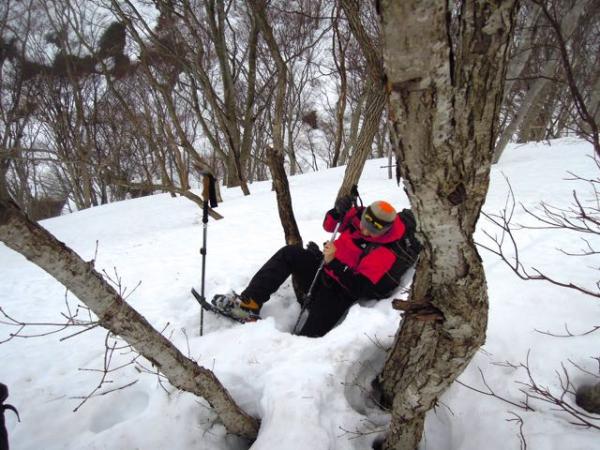 天気が良く、ザラメ状の雪で早々にスノーシューを装着しました。