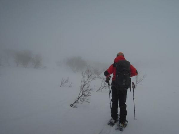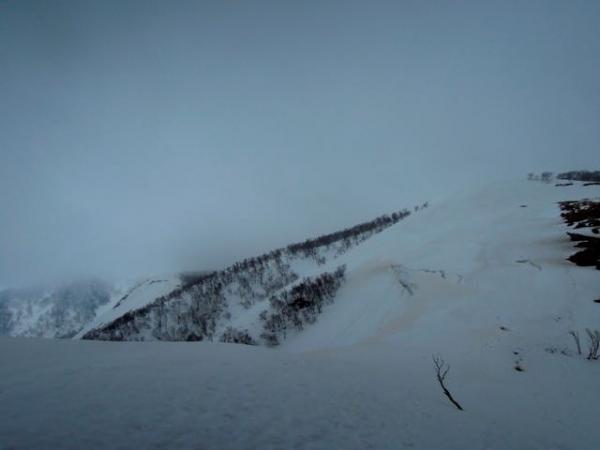稜線では雪庇に大きな亀裂が入っており、もう春ですねと言っていたら…背後から迫る灰色の雲。