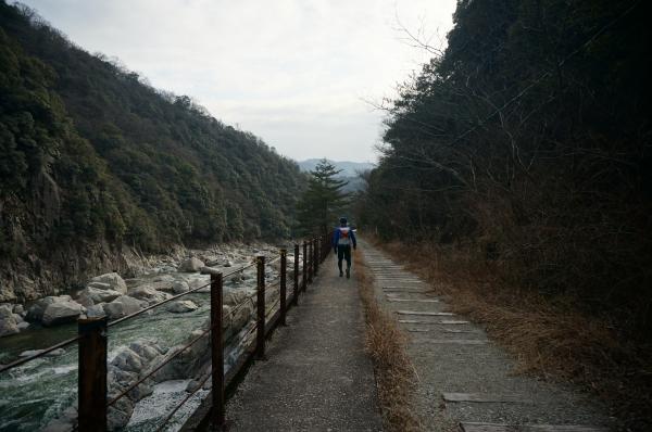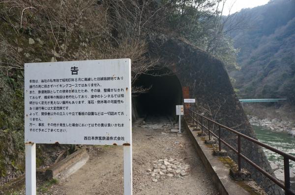 武田尾の廃線ウォークは何度もインターネットを通じて情報を得ていました。率直な感想は『手軽で面白い』!!兵庫県の自宅の最寄り駅から25分ほどで到着する武田尾駅から出発。駅前はすでに“秘境感”たっぷりで我々も興奮気味。ほどなく廃線の道に突入し、すでにテンションMAX!!昭和61年に廃線になったことを看板で知り、最近まで使われていたんだぁ、と言い合いさらに興奮を高める。しかし、大峰山への登山道に入ったら同行の妻のテンションはがた落ち( o )。急登でさらに落ち、山頂へ。テンションも体力も落ちてしまい、トレランのつもりがほとんど走らず、また曇ってきたため寒くなったのですぐに下山へ。隔水亭でカップラーメンを作り、ややテンションを持ち直し、廃線ウォークに戻ってからはスタート時のテンションに戻どりました(^_^)v
