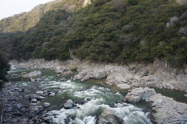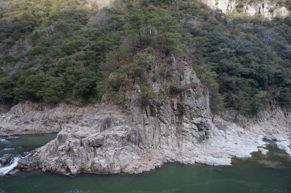 対岸に見える奇岩。時々見える河鳥(*エサを探して潜水を繰りかえる野生の鵜(う)がいました)。枕木に気をつけて安全に歩けば、こんなに近くて手軽でノスタルジックな登山はなかなか無いんじゃないですなねー。