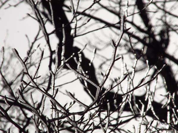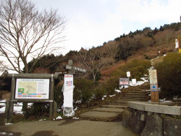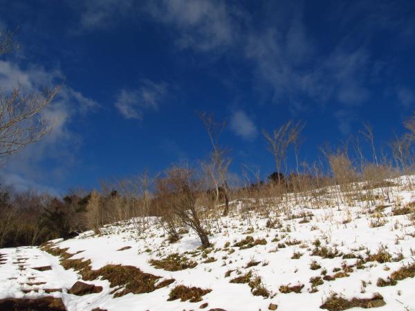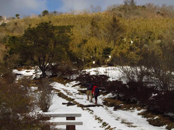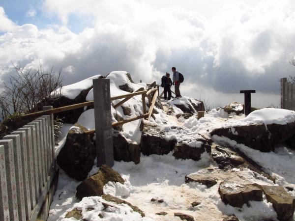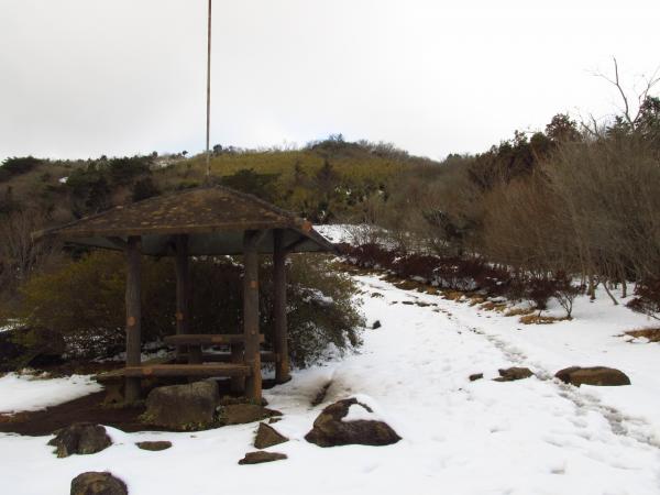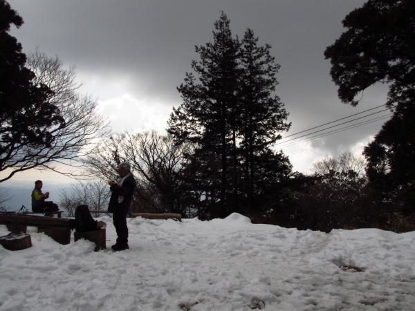 山頂下のベンチで一休みしていると雪が降ってきました。山頂のほんの一部だけのようです。低山ですが、天気の変化は急ですね。