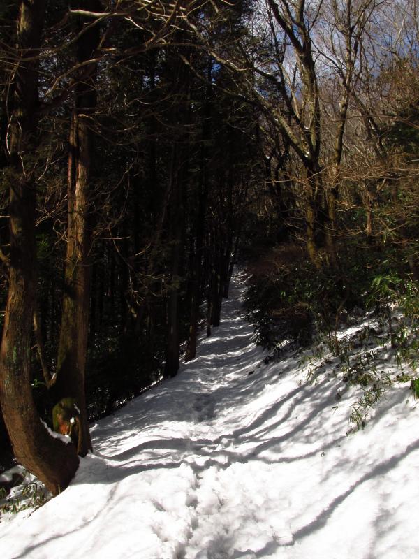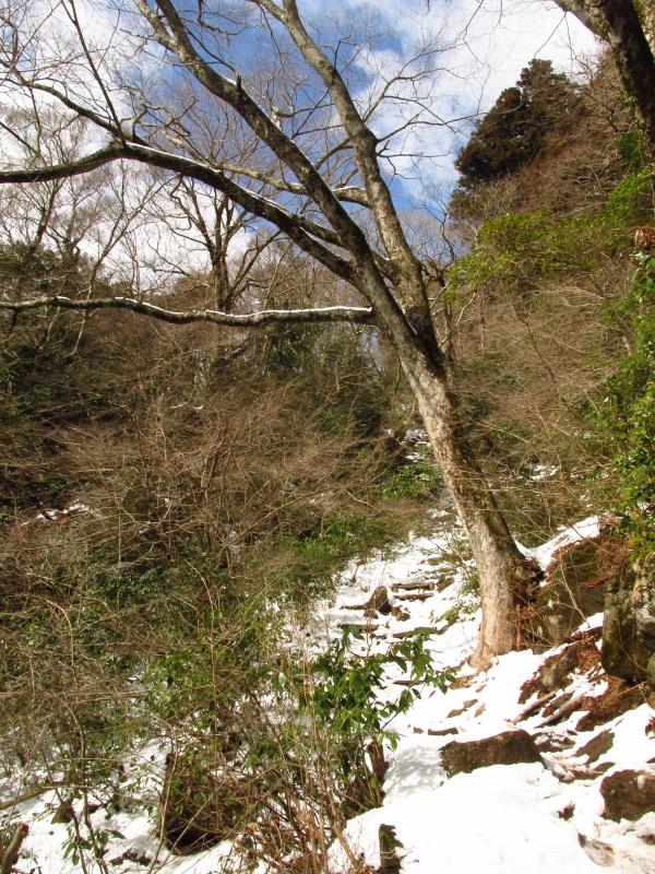 この先は階段が雪で覆われて滑る所、木陰で凍っていて滑る所がありました。真っ青の空を見上げながらゆっくり歩きます。