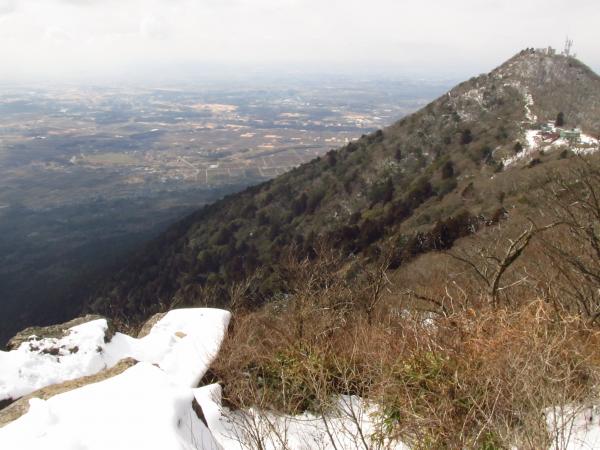 女体山山頂下は、傾斜が強く雪が積もり、その下に凍った所があったりして歩きにくい状況です。「こんなに雪があるとは思わなかった」と楽しんで歩く登山者の皆さんとあいさつを交わしながら山頂へ。市街地が見下ろせる山頂は爽快です。