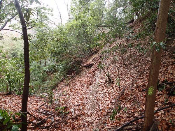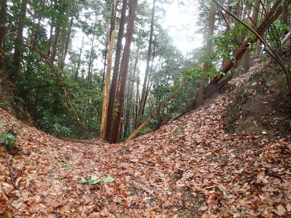 太鼓曲輪尾根には敵が尾根伝いに一気に攻め込まれないように人力で尾根を削った「堀切」といわれる人工的な鞍部が所々にあります。