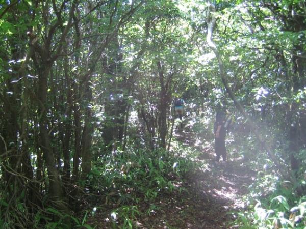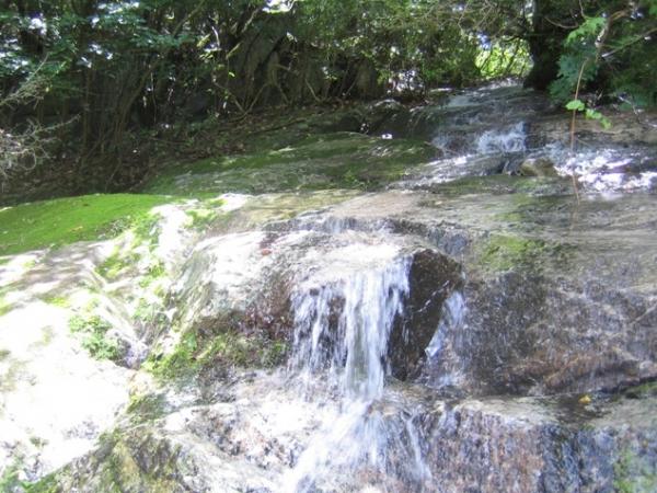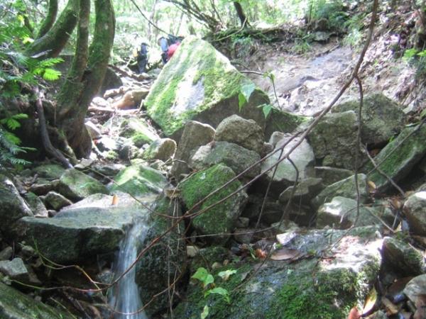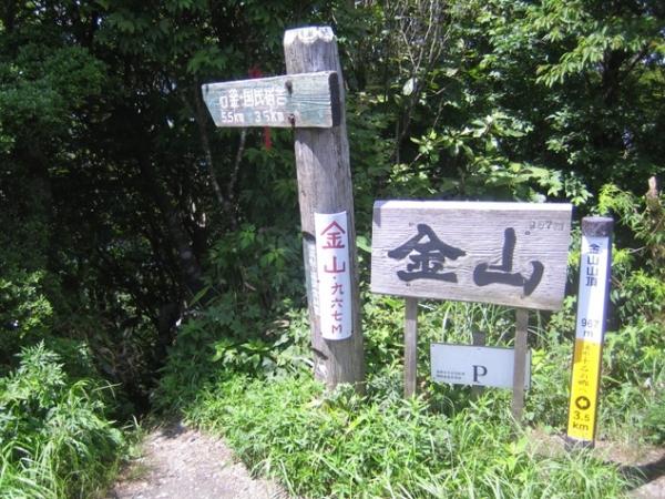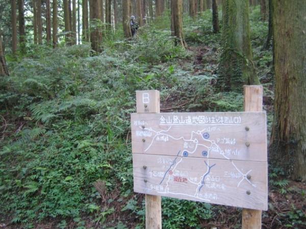 - 登山口>10分>坊主ヶ滝>5分>入渓点>30分>小屋跡>165分>登山道合流点>40分>金山山頂>75分>登山口