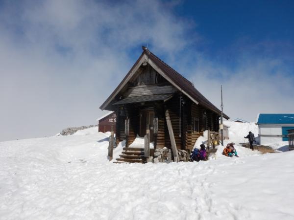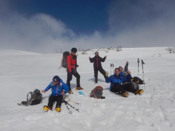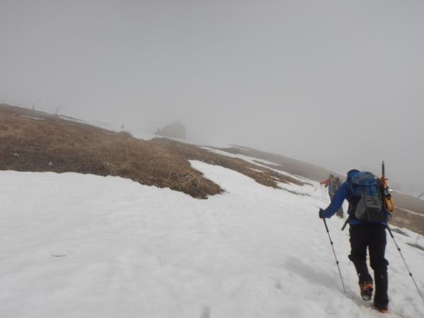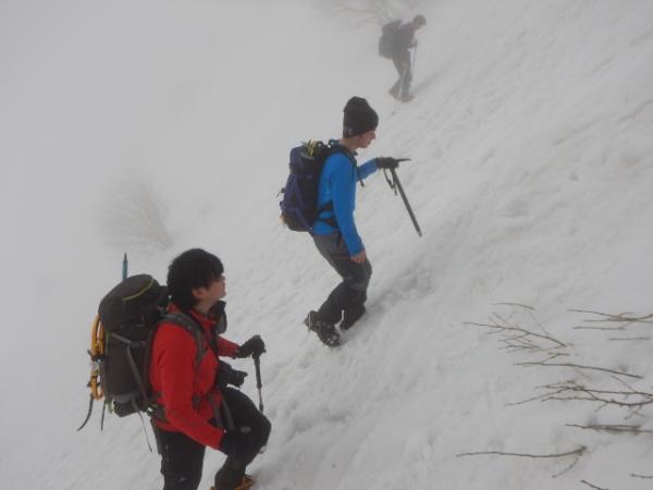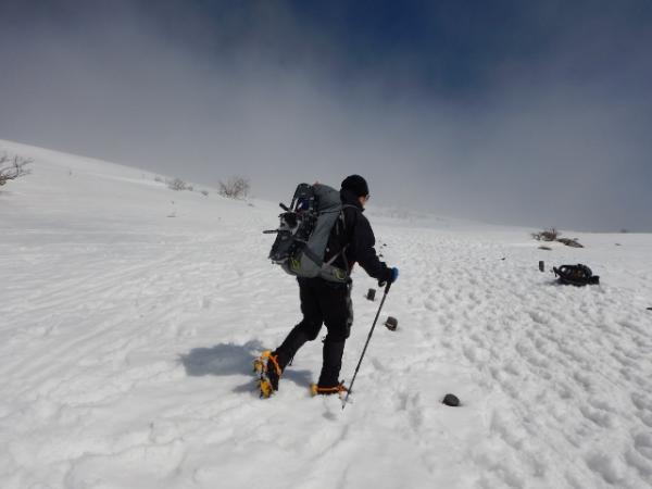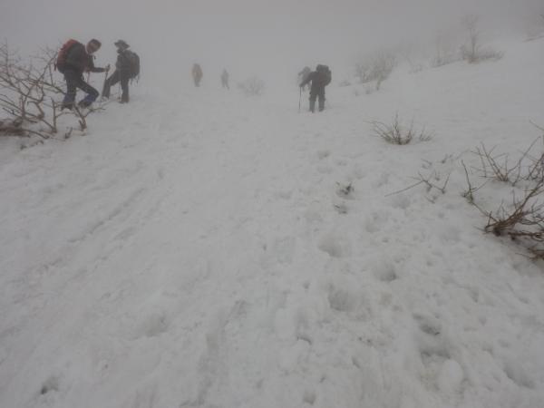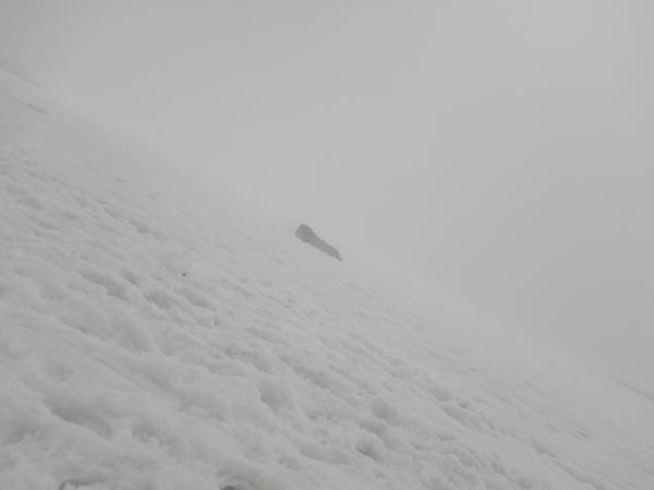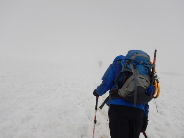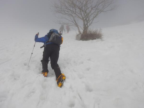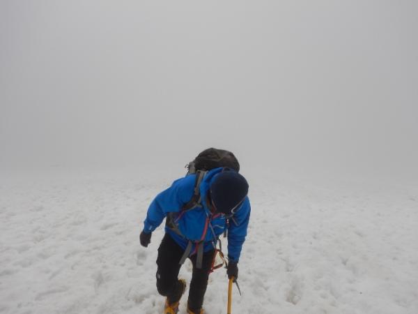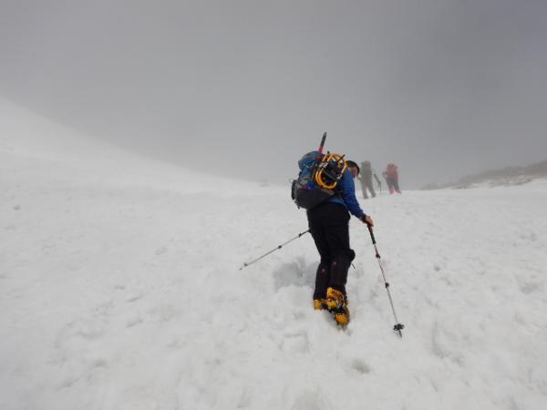 6合目の避難小屋でアイゼン・ピッケルを装着し急登を登っていきます。視界が悪く急登の終わりがなかなか見えませんでしたが、息をきらしながら雪の斜面を登っていくのも気持ち良かったです。