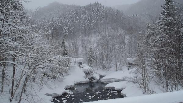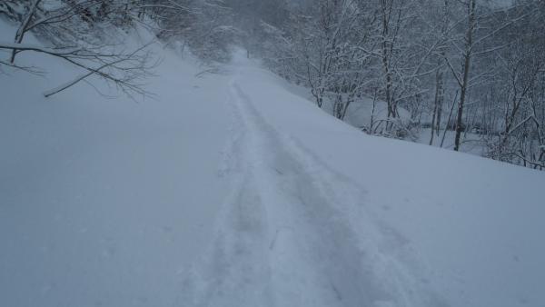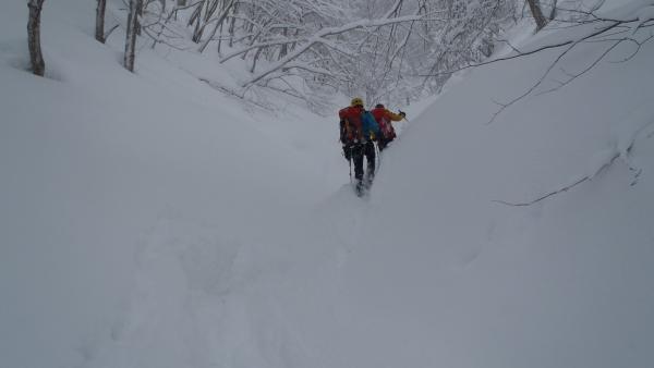 天狗平までの林道を辿り、さらに沢沿いに詰めますが雪崩に十分注意しましょう。