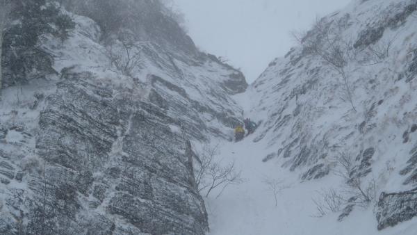 林道から深いラッセルを延々と続け、雪崩の危険性に怯えながら中央クーロアールを目指しましたが、なんと中央クーロアールは大部分が雪で埋まっていました。ハーネスを忘れてしまった僕は(大失態ででした・・・)1ピッチ目のみノーロープで登り引き返しました。