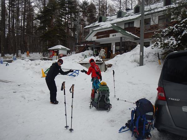 今回は雪の八ヶ岳と赤岳鉱泉のそばにあるアイスキャンディでクライミングを楽しんできました。車がスタッドレス装着の普通車なので美濃戸口の八ヶ岳山荘に駐車(一日500円、チケットを見せるとコーヒー1杯サービス付き)。今回は2泊とも赤岳鉱泉に泊めていただく予定でしたが、雪山とアイスクライミングの両方の装備を持って行ったのでテント泊以上の重さに・・・