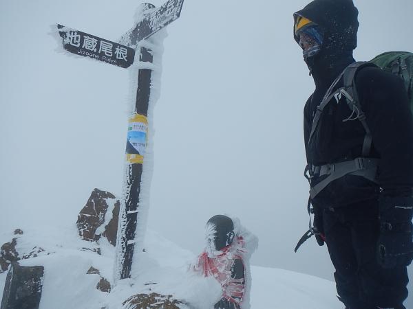 翌朝、朝食をたらふくいただき赤岳目指して出発!行者小屋まではトレースがあり楽勝ムードで進むも、そこからトレースがなくなり地蔵尾根を自力で突き進みます。稜線手前にナイフリッジがあり慎重に抜けるとお地蔵様が鎮座して待ち構えていました。かなり険しい形相です。気を引き締め直し稜線を赤岳へ。