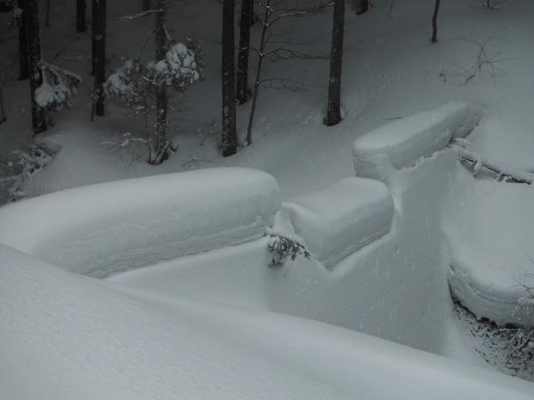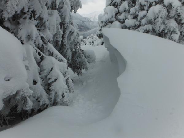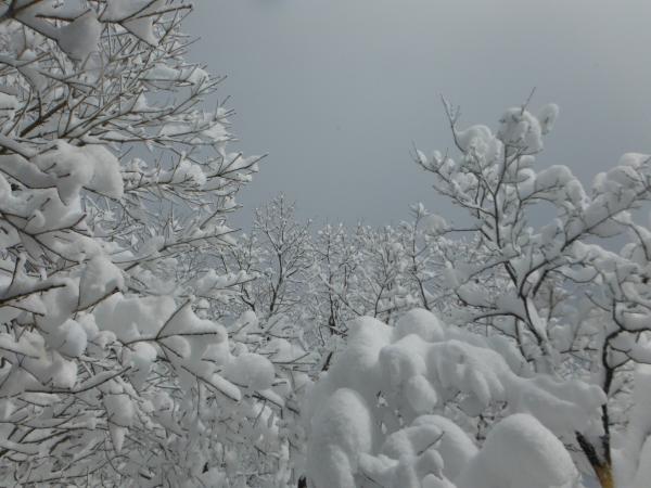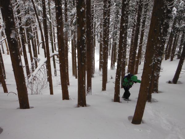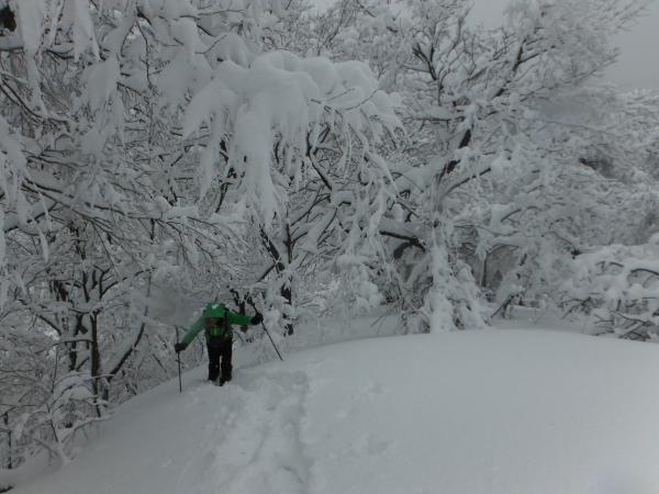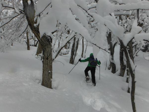 前日、前々日の雪の影響でスノーシューを履いても最初は足首までは軽く埋まり、分岐から先は膝上から腰まで埋まる雪でした。