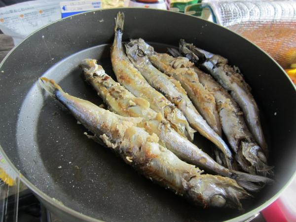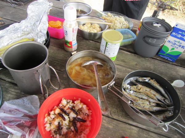木徳 寿司に八ヶ岳のお土産イナゴのお寿司と サツマイモの味噌汁、シシャモ。