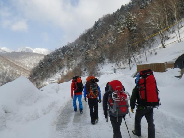 - 坂巻温泉→(90分)中千丈沢出合→(90分)氷瀑群