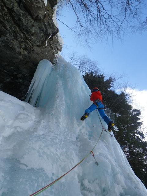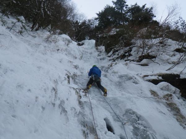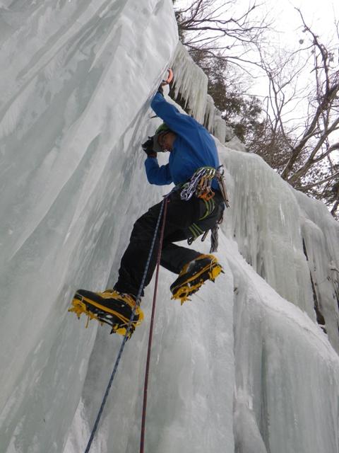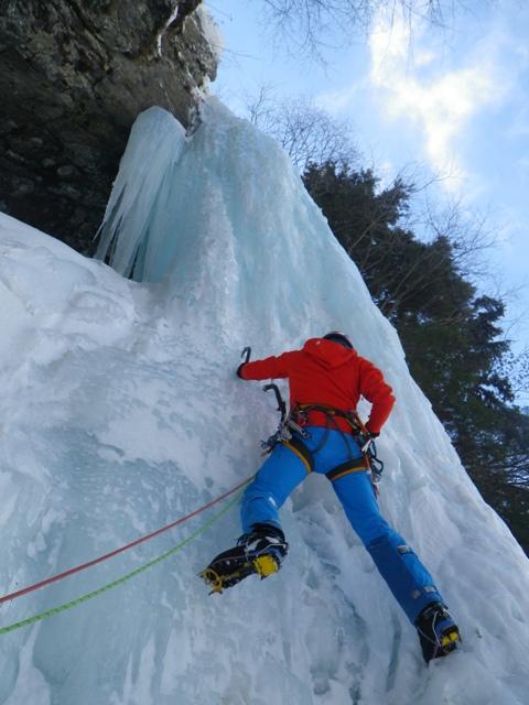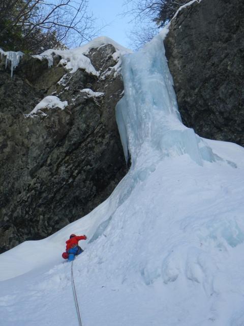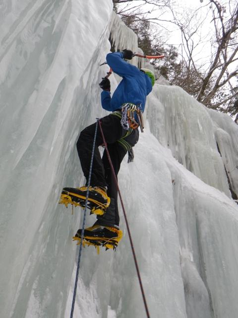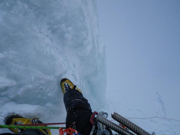 コメットよりは傾斜がキツいですが、きれいに凍った氷面にピックとフロントポイントが気持ちよく刺さります。“角”部分手前の緩傾斜帯でピッチを切り、リード交代。