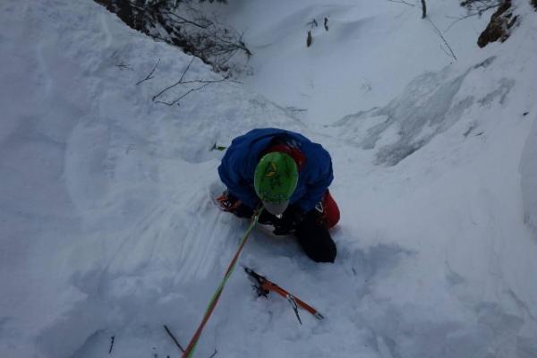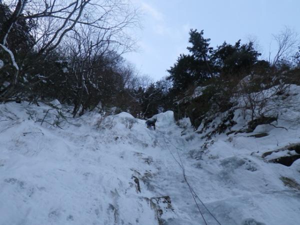 傾斜が少し落ち、ここも楽しんで登れるピッチ。上部はさらに緩くなった上に雪が深かったため途中でピッチを切り降りました。