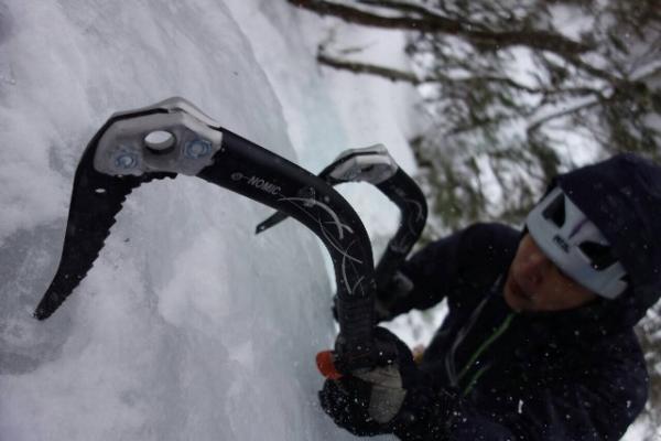 BDのエクスプレスアイススクリューとペツルのレーザースピードライト。ペツルのNEWスクリューは本当に食い込みが凄い。BDが悪いわけじゃありませんが、その差は歴然としていました。
