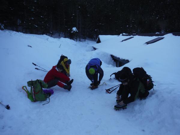 やがて、沢沿いになり、堤防を越えれば美濃戸山荘に到着です。ここでアイゼンを外します。