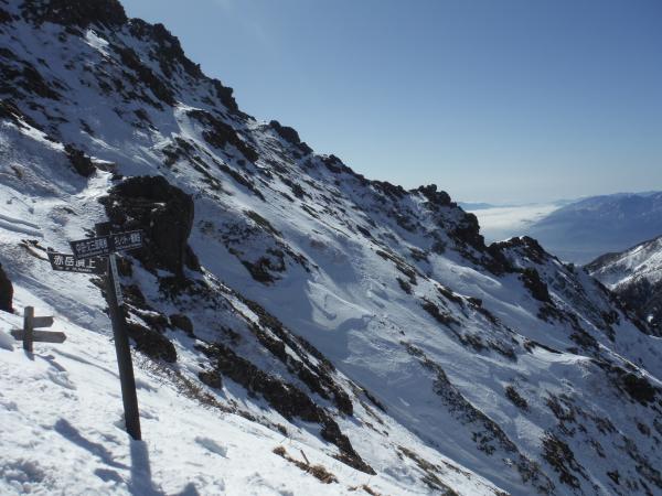 地蔵尾根までは、一気に高度を下げていきます。当然、スリップは大変なことになりますので、しっかりとアイゼンを効かせて下りましょう。