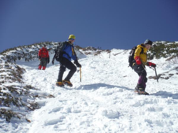 ■天候が安定していれば、とても登りやすい春の山ですが、3月は一度天候が崩れれば冬山に戻ります。基本装備を持って出るのは勿論、露岩した場所を12本爪アイゼンでしっかり歩ける技術は最低条件です。