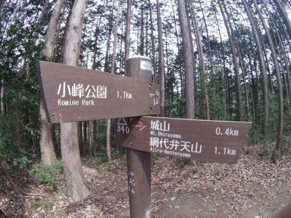 - 小峰公園駐車場~40~網代城山~20~網代弁天山~20~貴志嶋神社鳥居~60~網代集落を経て小峰公園