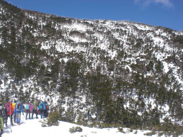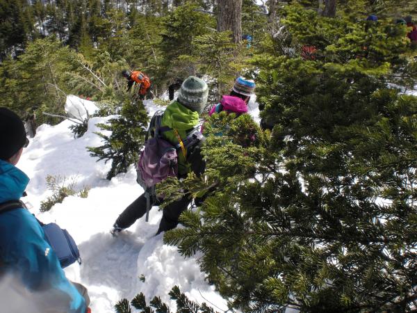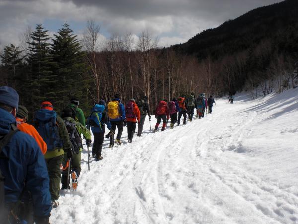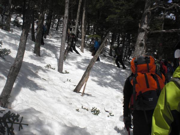 大倉ガイドの判断で、雨池山へは向かわずに、東の急斜面を下り一気に林道へ抜けるルートへ変更。ヒールでのキックステップの良い練習になりました。