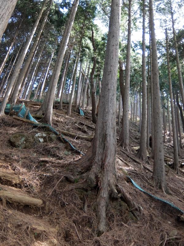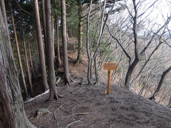 林業作業者の看板があり、これを南へ尾根を下ります。