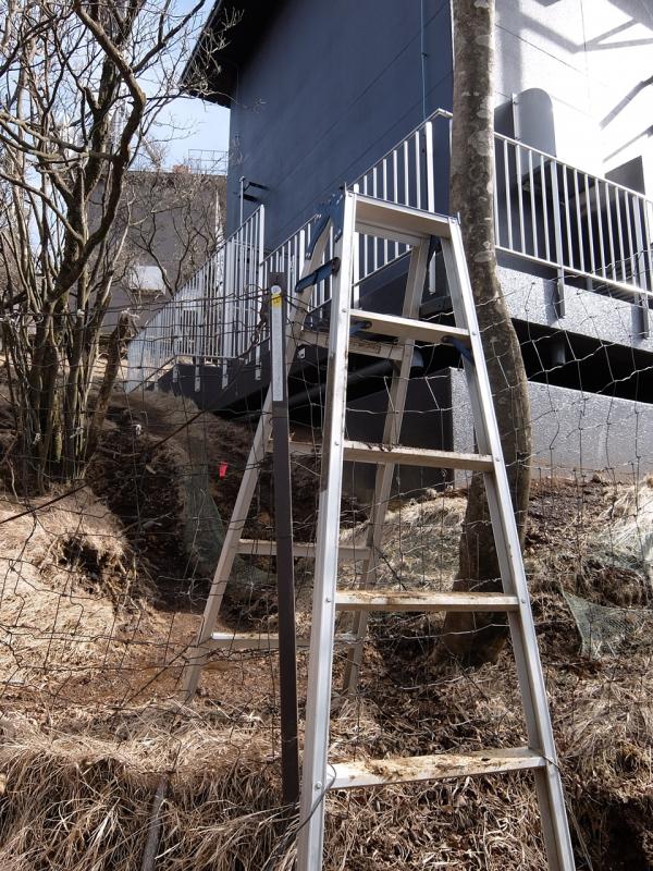 裏手に鹿避けの網を超えるようにしてアルミの脚立が立っています。