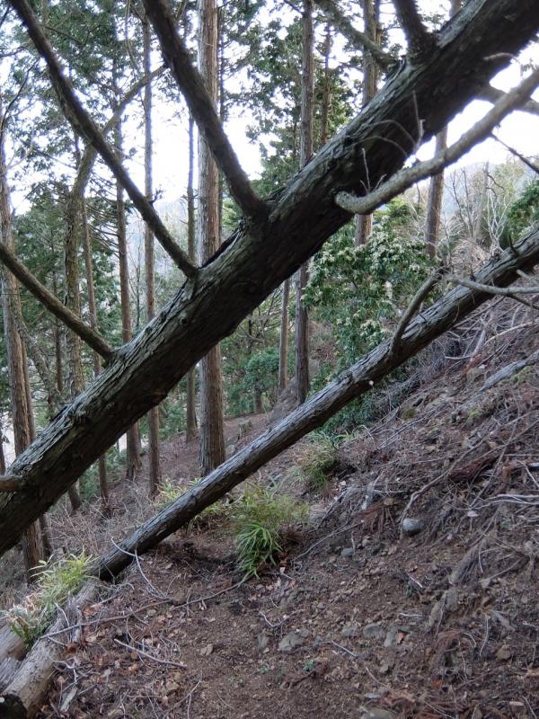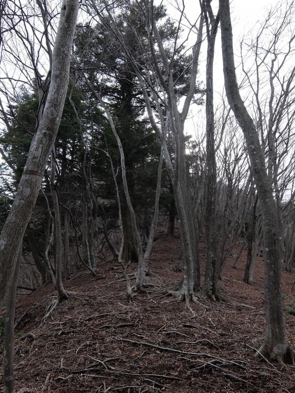 尾根上の下りは急で、すごく滑るザレ、うねった木の根や岩場の連続です。