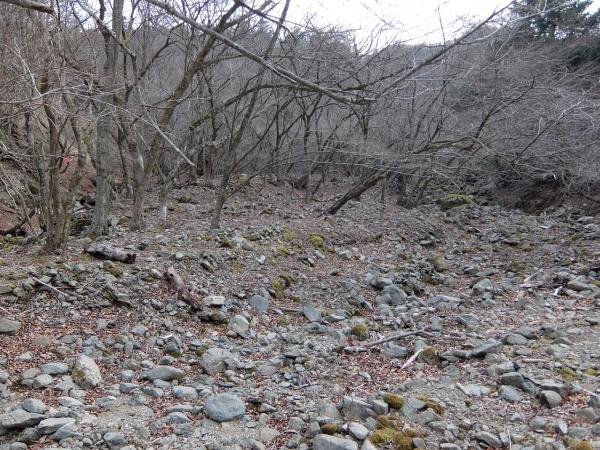 地図によると涸れ沢から対岸にルートがあるはずですが、いくら見ても分かりません。