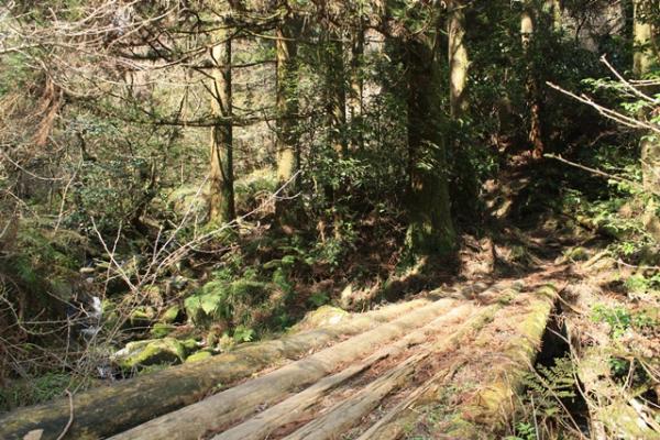 橋は、丸太で濡れていることが多いので、滑らないように慎重にわたってください。