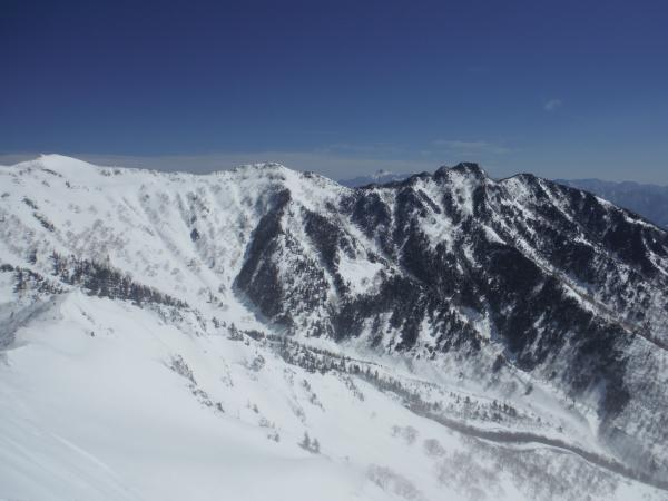 既に雪が消え茶色の山肌が目立つ群馬県の山々の中で、未だに雪を湛えキラキラ輝いている武尊山はやはり格別の美しさでした。スキー場へ着くと空気はひんやり。麓とは違い未だここは冬のようです。さらに予想外にリフトが寒く歩き出す頃には体がキンキンに冷えてしまったので、最初からハイペースで体を暖めなければなりませんでした。最初のピーク・剣ヶ峰山に着くと、前方の武尊山の全容が見渡せるようになります。最高峰の沖武尊を中心に、東側には家ノ串山、川場剣ヶ峰、前武尊と馬蹄形の連なりが見渡せました。