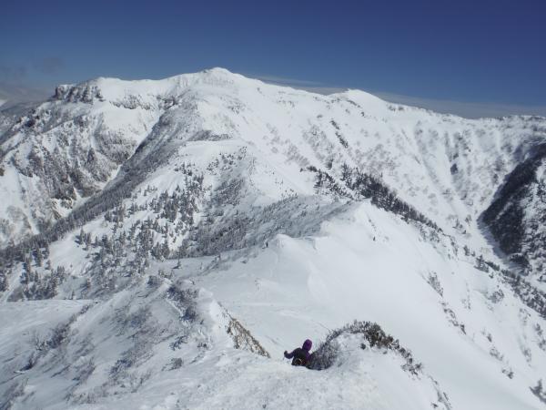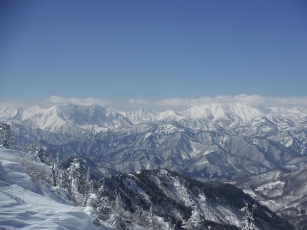 頂上からは尾瀬や谷川などの県境の山々や上毛三山、浅間山などが見渡せました。頂上はエビの尻尾が発達するだけあって風が強く、すぐにお暇して直下の穏やかな雪原で休憩。有難いことに帰りは行きよりも空が晴れ渡り、赤城山の裾野は一層美しく、谷川の一ノ倉沢もくっきりと見えました。